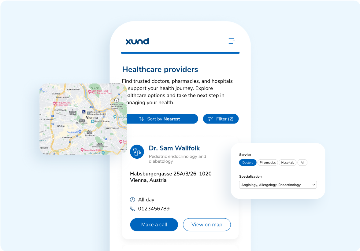 Using structured check results, Healthcare Providers recommends relevant next steps tailored to each user’s needs. These pathways may include recommendations for local general practitioners (GPs) or specialists, nearby pharmacies, or digital health solutions. As the range of available healthcare providers varies from country to country, XUND adapts the recommendations to suit the specific locations. This ensures that users receive personalized and localized healthcare options, optimizing their journey toward better health outcomes.