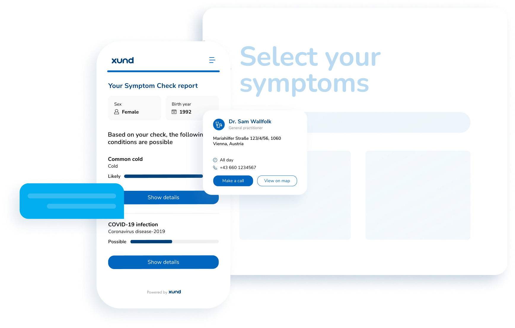 Using structured check results, Healthcare Providers recommends relevant next steps tailored to each user’s needs. These pathways may include recommendations for local general practitioners (GPs) or specialists, nearby pharmacies, or digital health solutions. As the range of available healthcare providers varies from country to country, XUND adapts the recommendations to suit the specific locations. This ensures that users receive personalized and localized healthcare options, optimizing their journey toward better health outcomes.